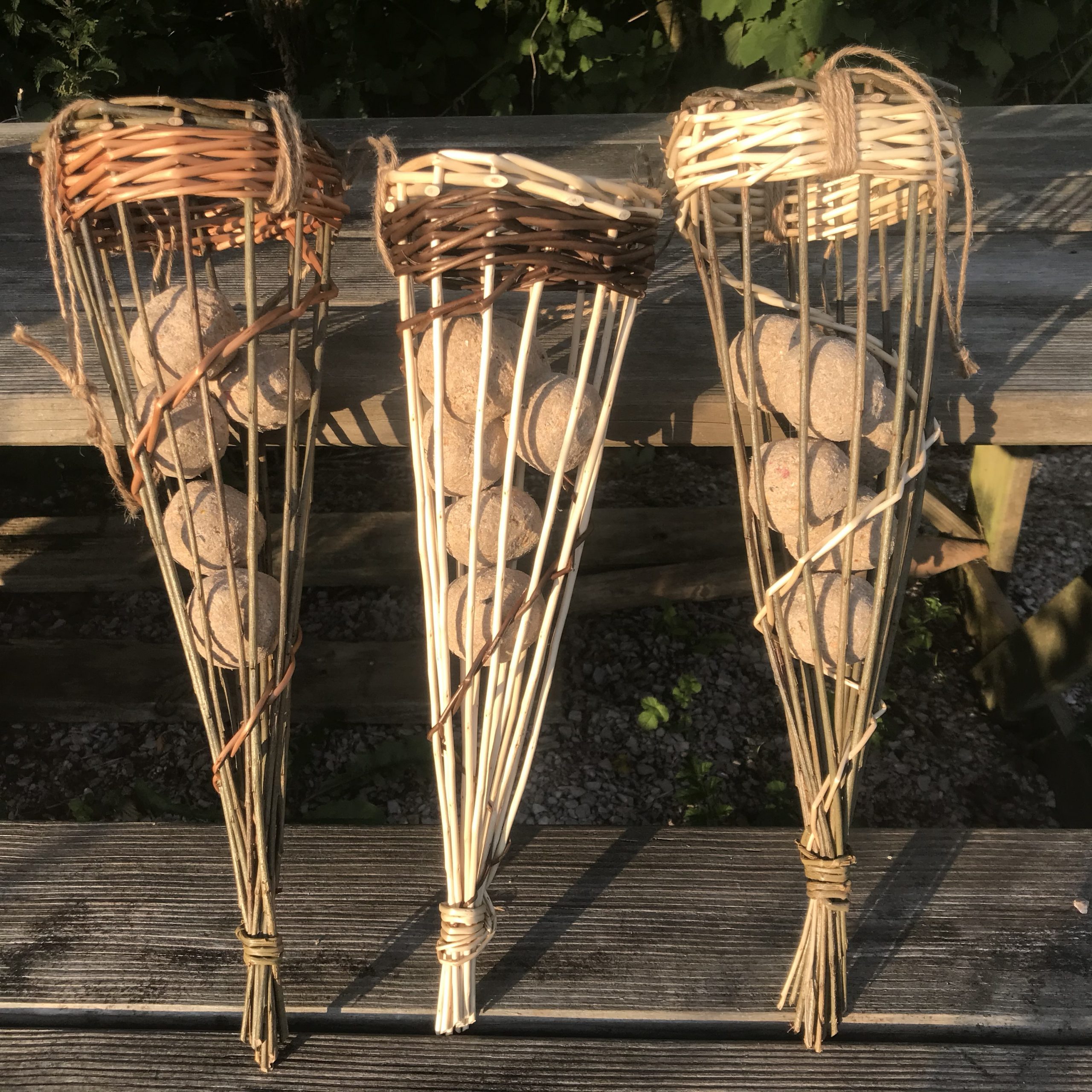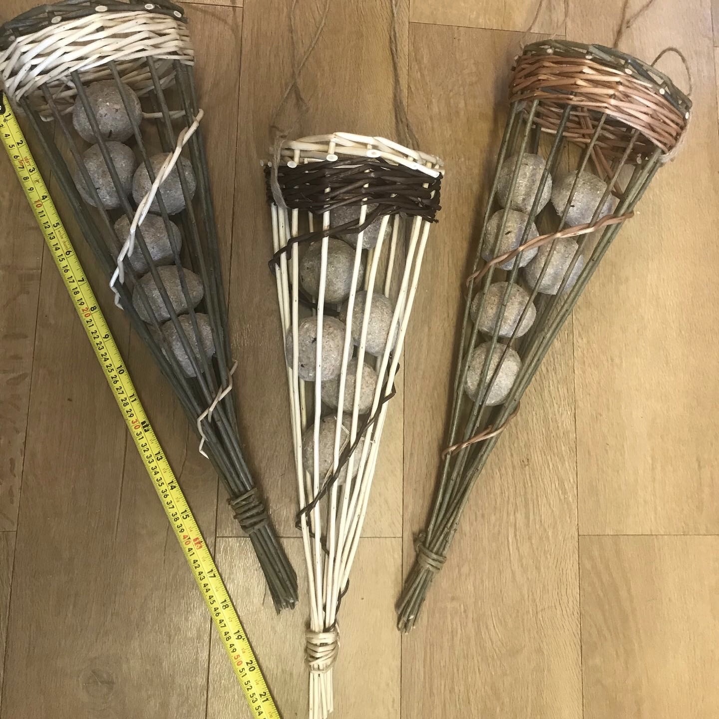 Willow bird feeder with 6 fat balls, wildlife conservation.